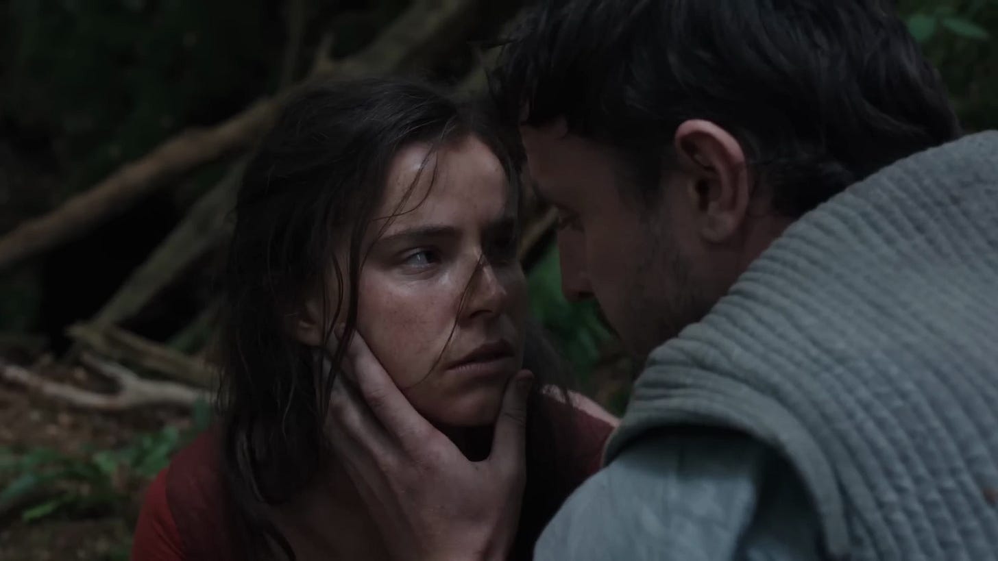 Hamnet is the story of Agnes1 Hathaway (Jessie Buckley), a woman who lives in the town of Stratford in England’s West Midlands. She spends her days foraging for herbs and hanging out with her hawk in the woods until one day she meets a local Latin tutor named Will Shakespeare (Paul Mescal) who catches her eye. They fall in love, get married, have children, and lead a generally happy life in Stratford but for the long stretches when Will leaves for London to work with a theatrical company. Their idyllic life is interrupted when their young twin children Judith (Olyvia Lynes) and Hamnet (Jacobi Jupe) fall ill with the plague, with Hamnet ultimately dying of the disease. Agnes blames Will for not being by their son’s side as he dies, and both parents fall into a deep depression afterwards. Will’s financial successes in the theater does nothing to lift Agnes’s spirits until one day she travels to London to see a new play that Will is putting on: The Tragedy of Hamlet.